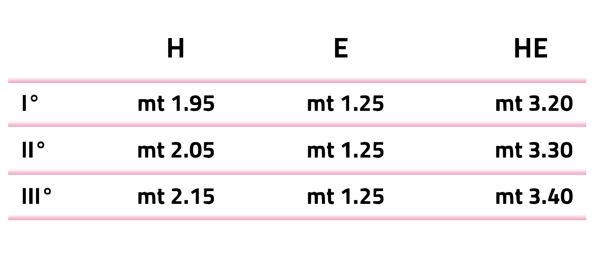 - Altezza piantone: cm 195 – 205 – 215; altezza massima tetto: cm 320 – 330 - 340