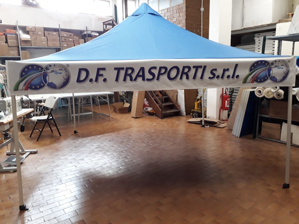 D.F. Trasporti realizza con ARTUM un gazebo interamente personalizzato sulle mantovane con loghi e scritte; un lavoro semplice e di impatto visivo raggiunto dal contrasto di colori e dalla scritta tridimensionale