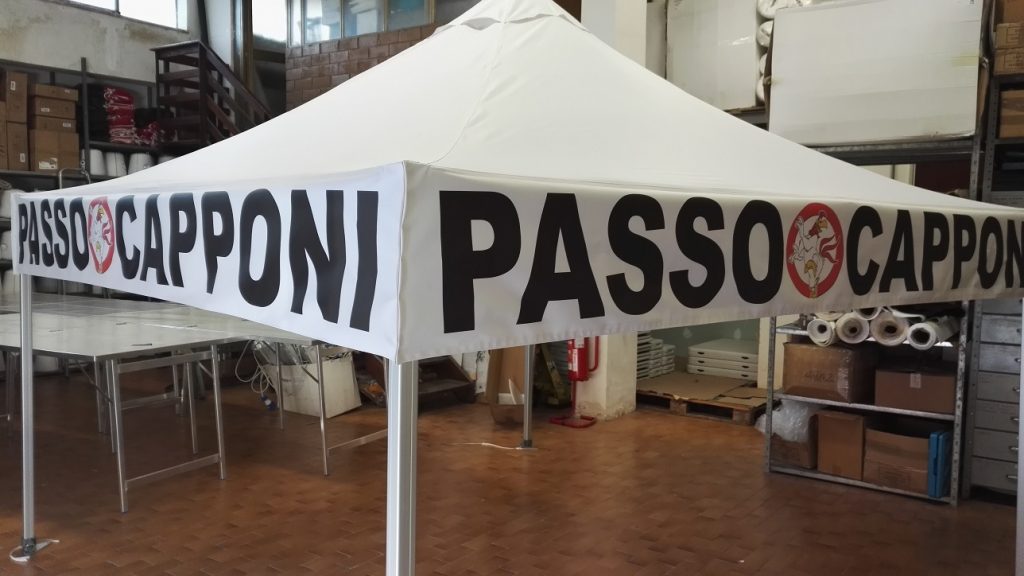 Grafica realizzata su misura per il nostro cliente PASSO CAPPONI, che sceglie una parete personalizzata con apertura centrale a mo di porta interamente realizzata a mano, rifinita con zip per facilitare l’apertura ed il fissaggio. LE 4 mantovane interamente stampate per ricoprire al massimo lo spazio disponibile e garantire una grande visibilità