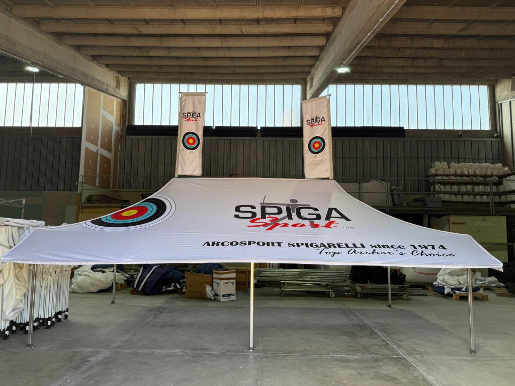 Gazebo pieghevole 3×6 con pensilina personalizzato e completo di bandiere e accessori
