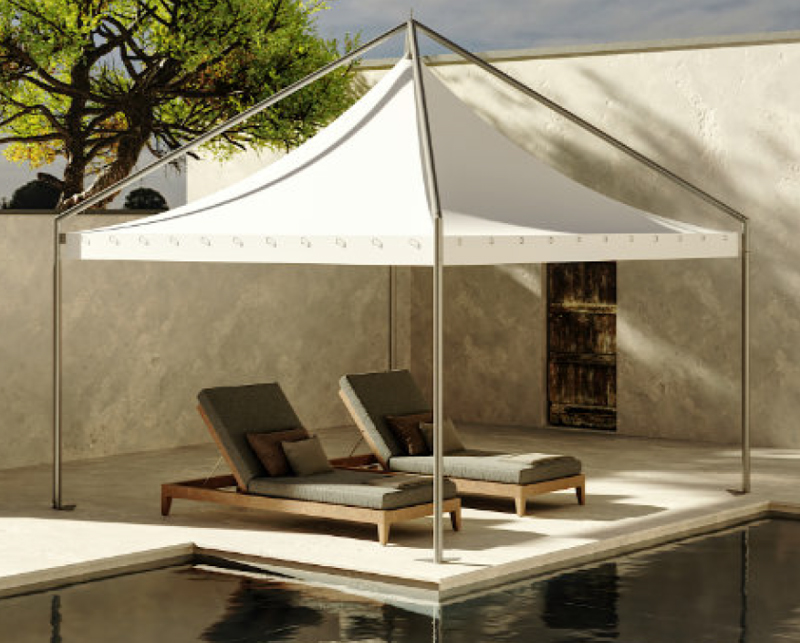 Il modello Fly si presenta con una struttura portante componibile in acciaio zincato e paleria esterna. La copertura è in tessuto PVC ad alta resistenza a forma piramidale messa in tensione tramite un sistema a vite posto alla sommità. A disposizione due modelli di pareti: fisse e scorrevoli, personalizzabili con porte e finestre.